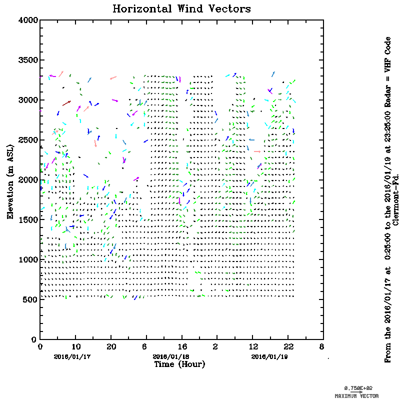 Vent horizontal mesuré par le radar UHF de Clermont-Ferrand durant Janvier (January) 2016