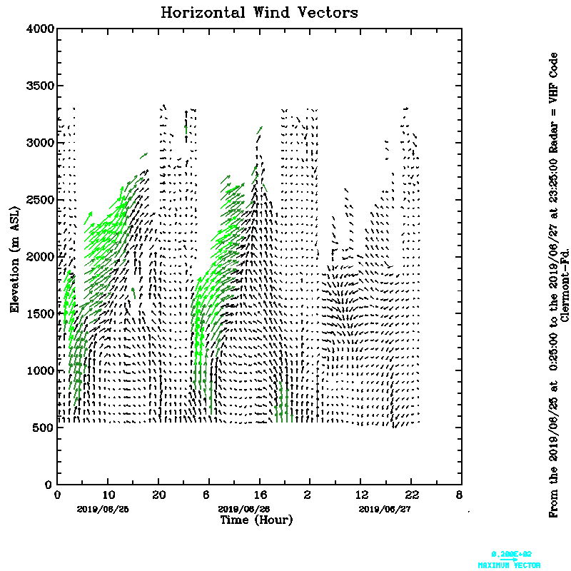Vent horizontal mesuré par le radar UHF de Clermont-Ferrand durant Juin (June) 2019